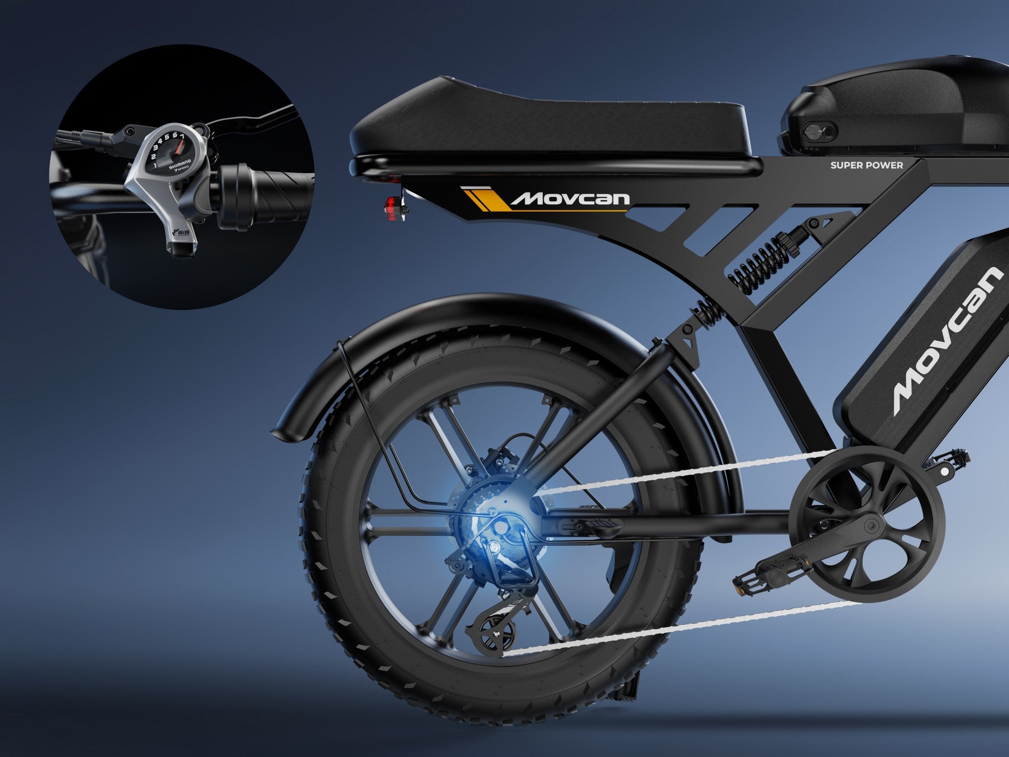 Thrill awaits with the Movcan dual battery fat tire electric bike, featuring a powerful 1500W rear motor (2000W peak), up to 32 MPH top speed, and a dual battery system for extended range, making it a high power ebike ideal for commuting and everyday riding.