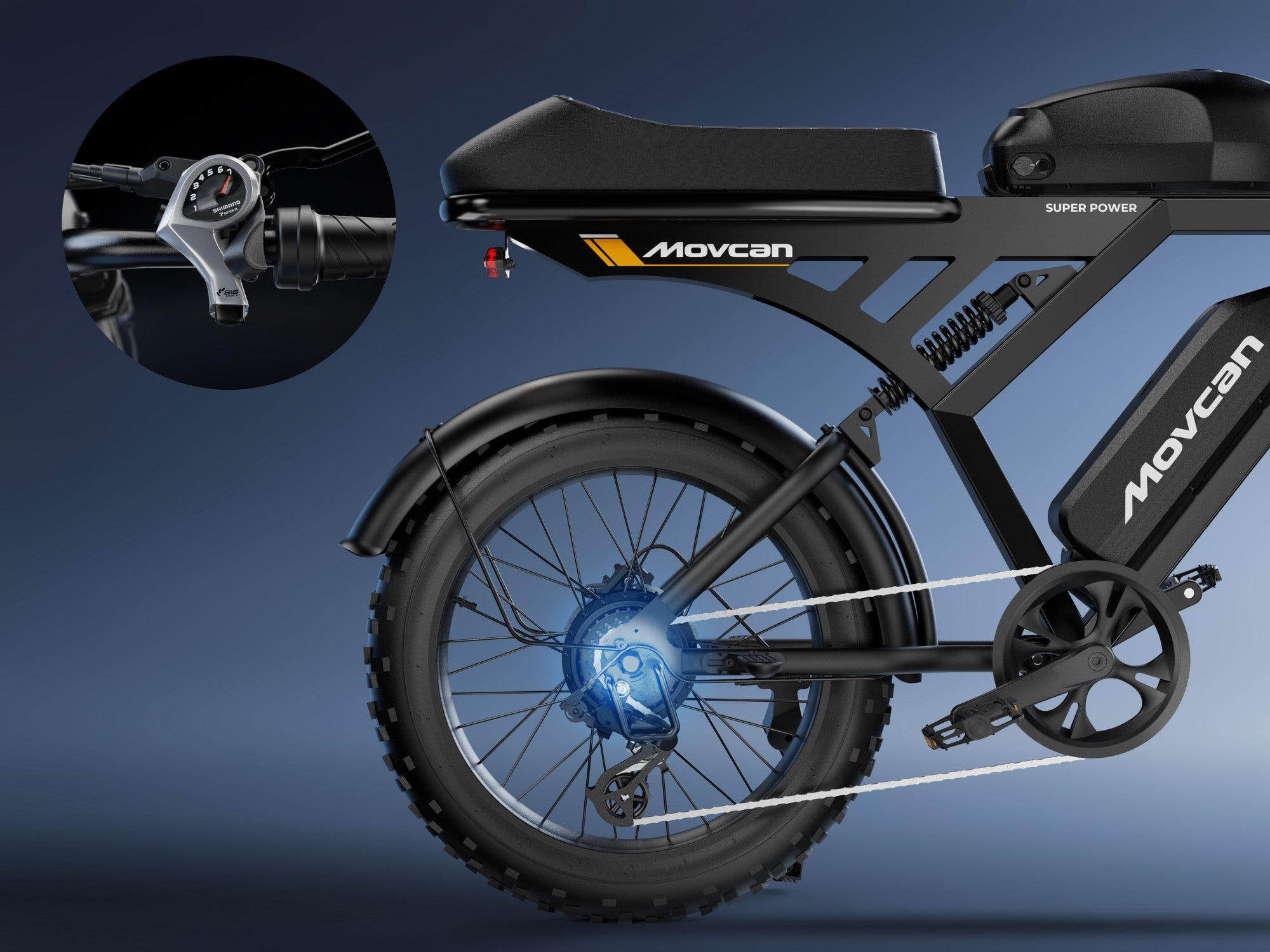 Power through any terrain with the MOVCAN V30 Pro Max.With a 3000W dual motor system, it delivers strong acceleration, fast speeds up to 37.5 MPH, and smooth hill climbing.The dual battery system offers up to 120 miles of range, making it perfect for long distance riding and daily commuting.Built with fat tires, full suspension, and hydraulic brakes, it’s designed for control, comfort, and all-terrain performance.