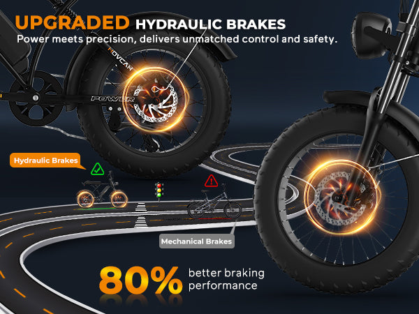 The Movcan V60 Pro fat tire eBike features upgraded hydraulic disc brakes designed for stronger and more reliable stopping power.